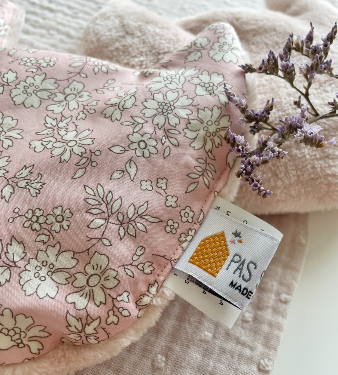 Les deux faces sont, comme toujours chez Pas si Sages…, différentes: le plus souvent une face en Liberty ou tissus imprimé et l’autre en velours de polaire ou fourrure si doux.