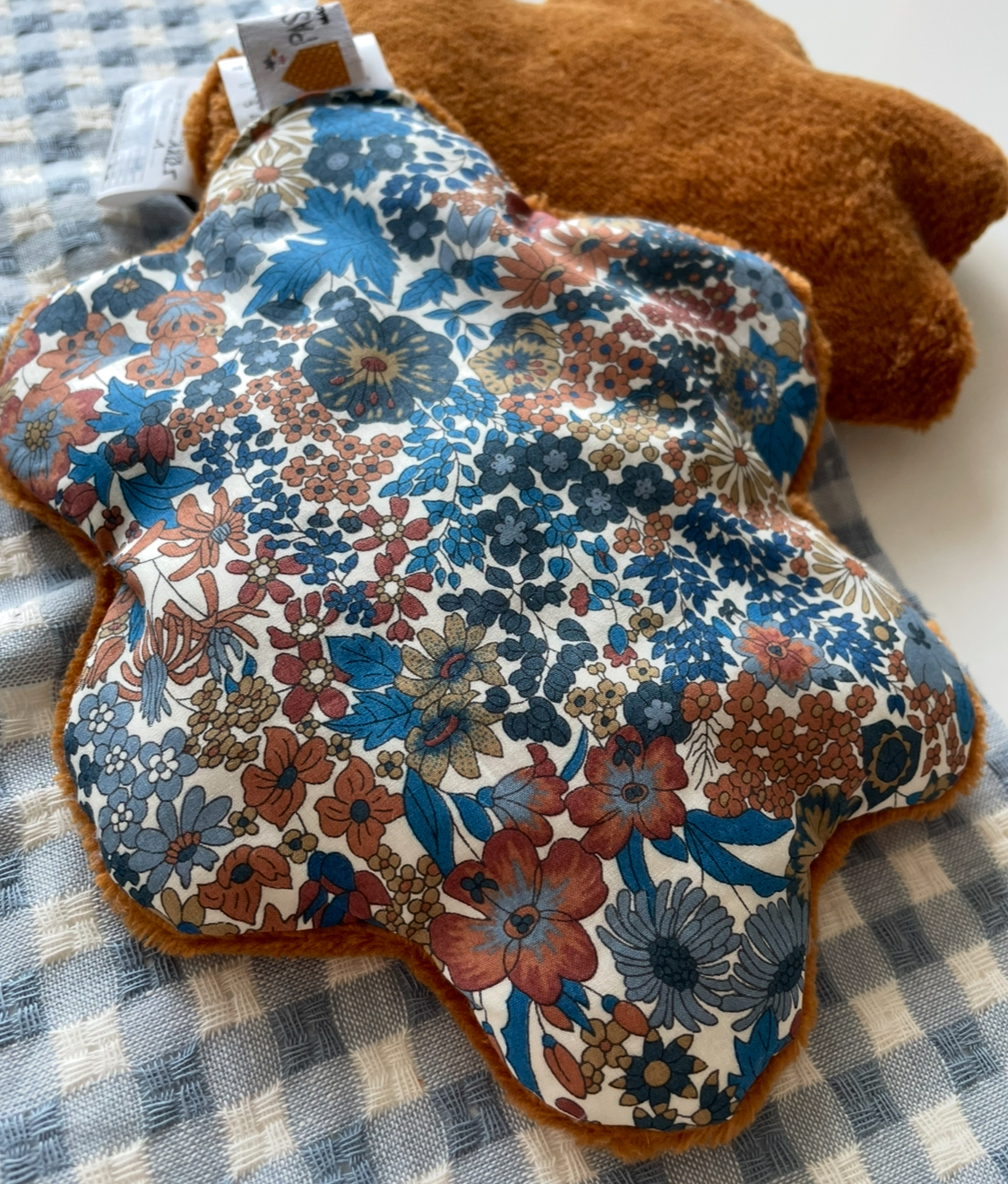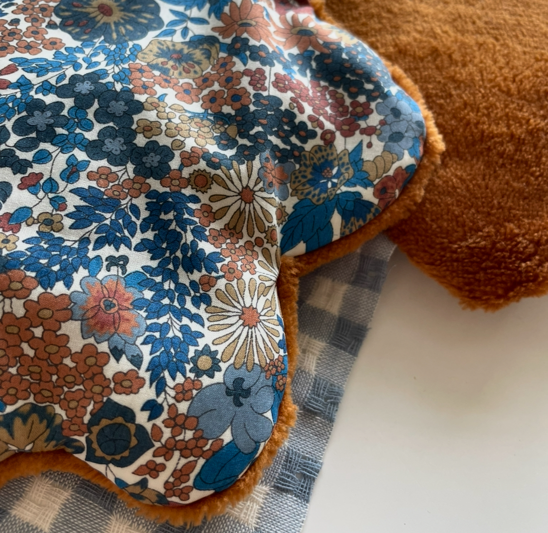 Les deux faces sont, comme toujours chez Pas si Sages…, différentes: le plus souvent une face en Liberty ou tissus imprimé et l’autre en velours de polaire ou fourrure si doux.