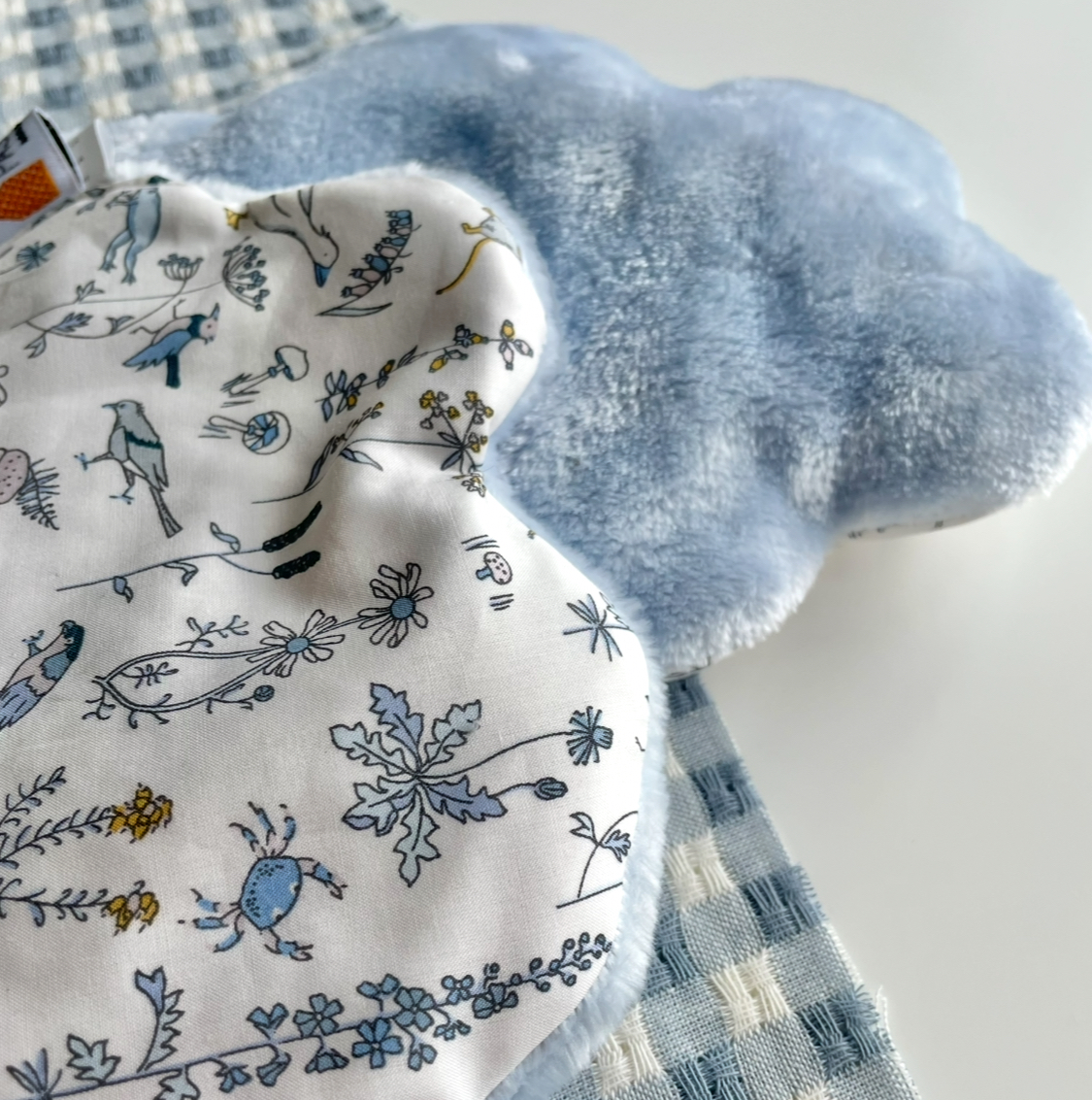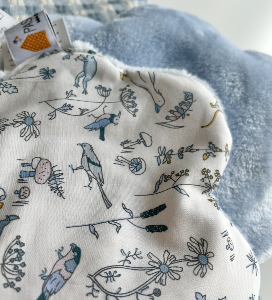 Les deux faces sont, comme toujours chez Pas si Sages…, différentes: le plus souvent une face en Liberty ou tissus imprimé et l’autre en velours de polaire ou fourrure si doux.