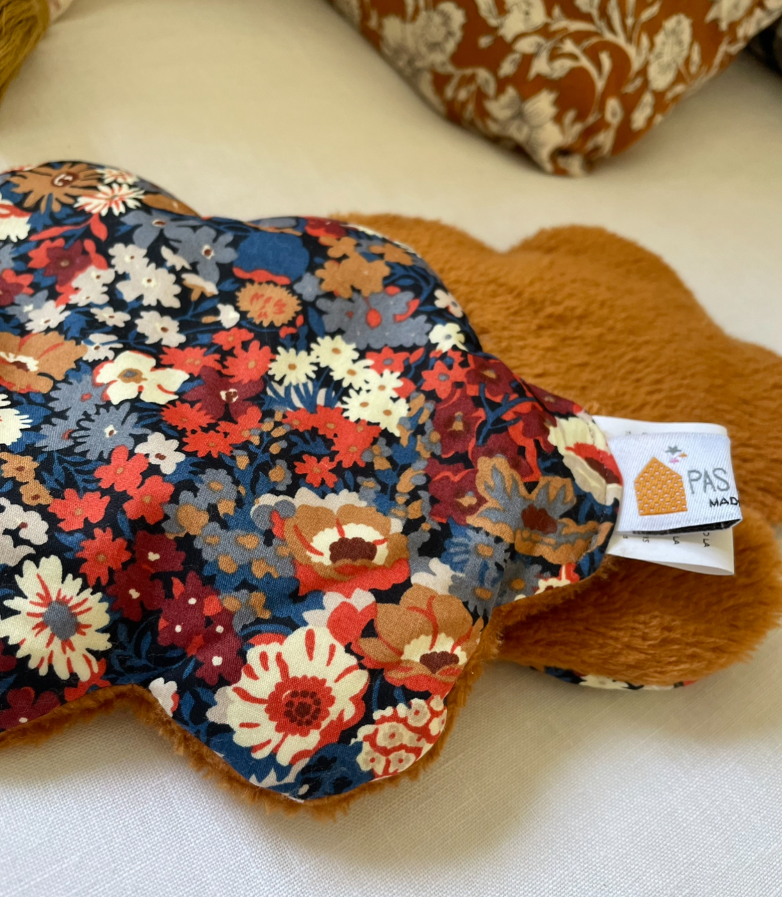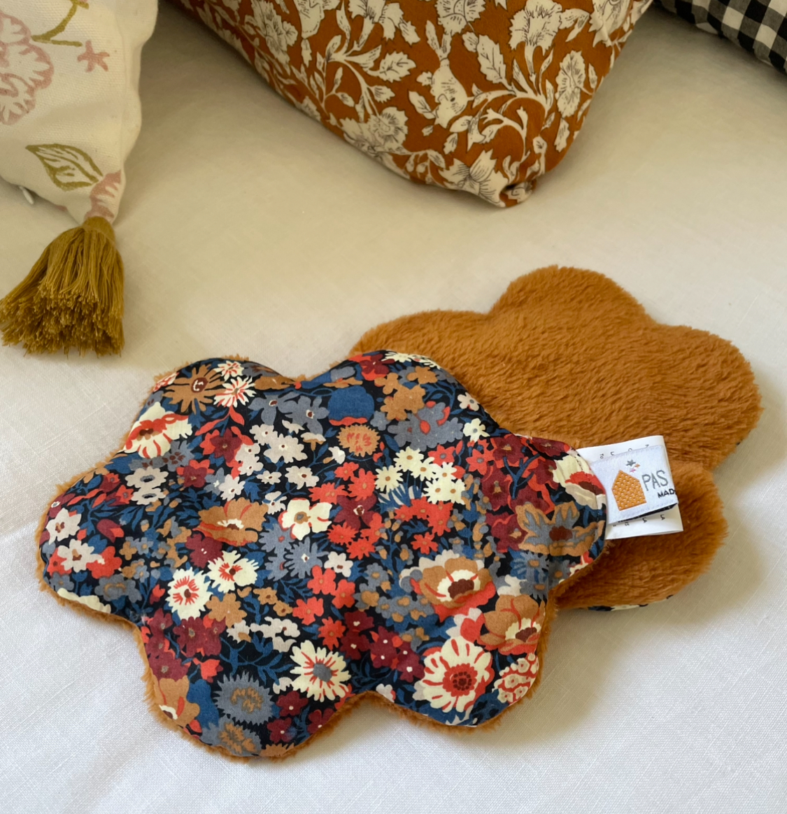 Les deux faces sont, comme toujours chez Pas si Sages…, différentes: le plus souvent une face en Liberty ou tissus imprimé et l’autre en velours de polaire ou fourrure si doux.
