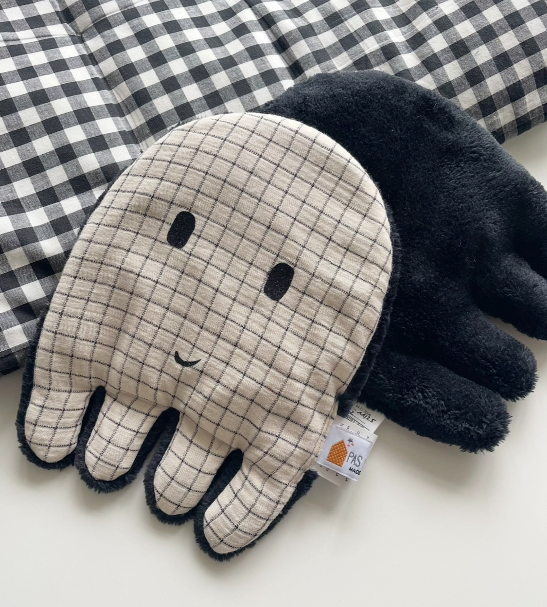 Les deux faces sont, comme toujours chez Pas si Sages…, différentes: le plus souvent une face en Liberty ou tissus imprimé et l’autre en velours de polaire si doux.